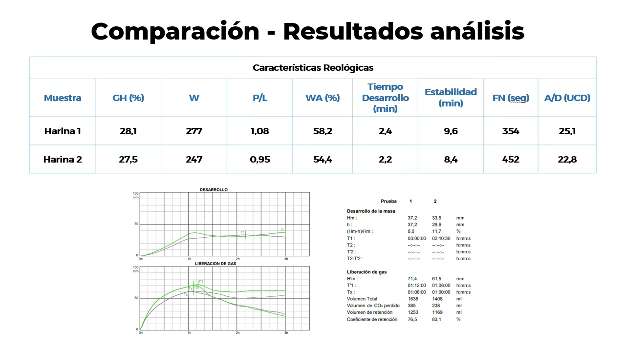 Al evaluar los resultados de gluten y el alveograma, no se evidenciaron diferencias significativas, por lo que se decidió profundizar el análisis, incorporando otros ensayos para comprender mejor las características / diferencias de cada harina.